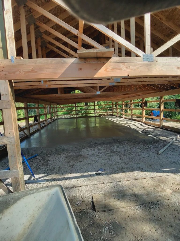 This service is used for garage floors, pole barn foundations, equipment pads, and commercial storage areas. It does not include decorative finishes, heated slabs, or epoxy coatings, though the slab can be finished to accommodate those additions later. If the site requires grading, drainage correction, or removal of unsuitable soil, that work is completed before the base preparation begins.